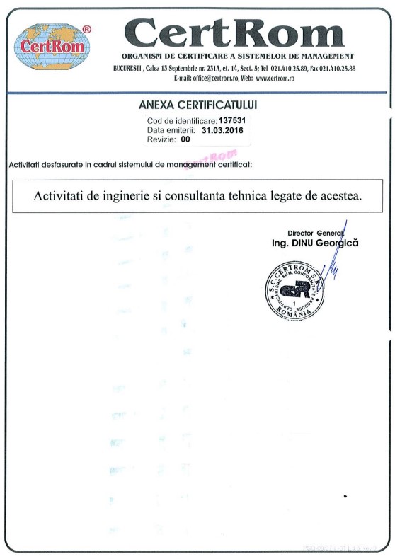 Personalul societății poate asigura, prin calificarea personalului angajat, consultanță pe parcursul execuției lucrărilor, verificarea proiectelor în vederea obținerii autorizațiilor de construcție, realizarea documentațiilor în vederea obținerii tuturor acordurilor și autorizațiilor necesare implementării cu succes a proiectelor realizate de societatea noastră și nu numai.